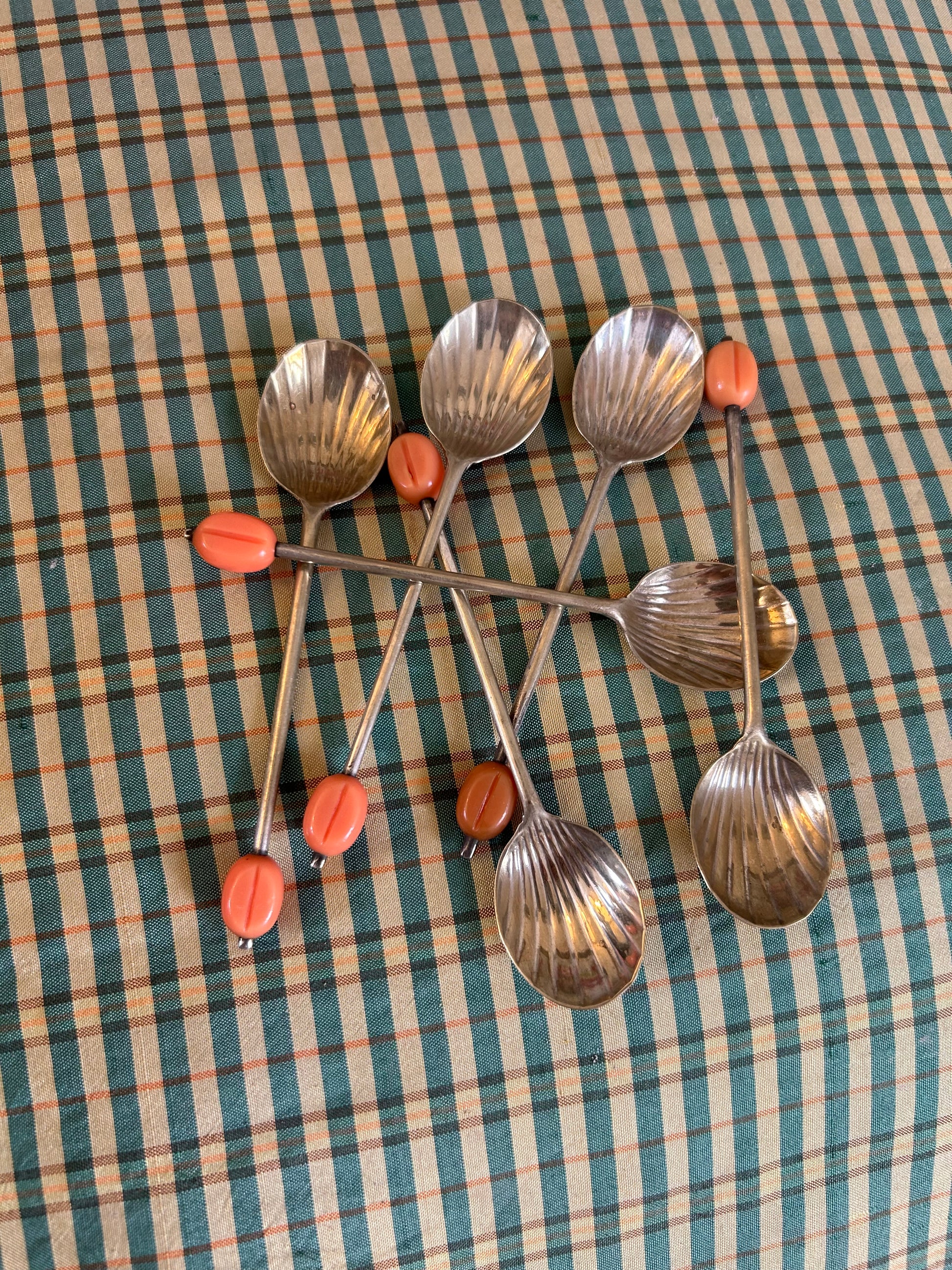 Silver plated shell coffee spoons with coral-coloured beaded ends
