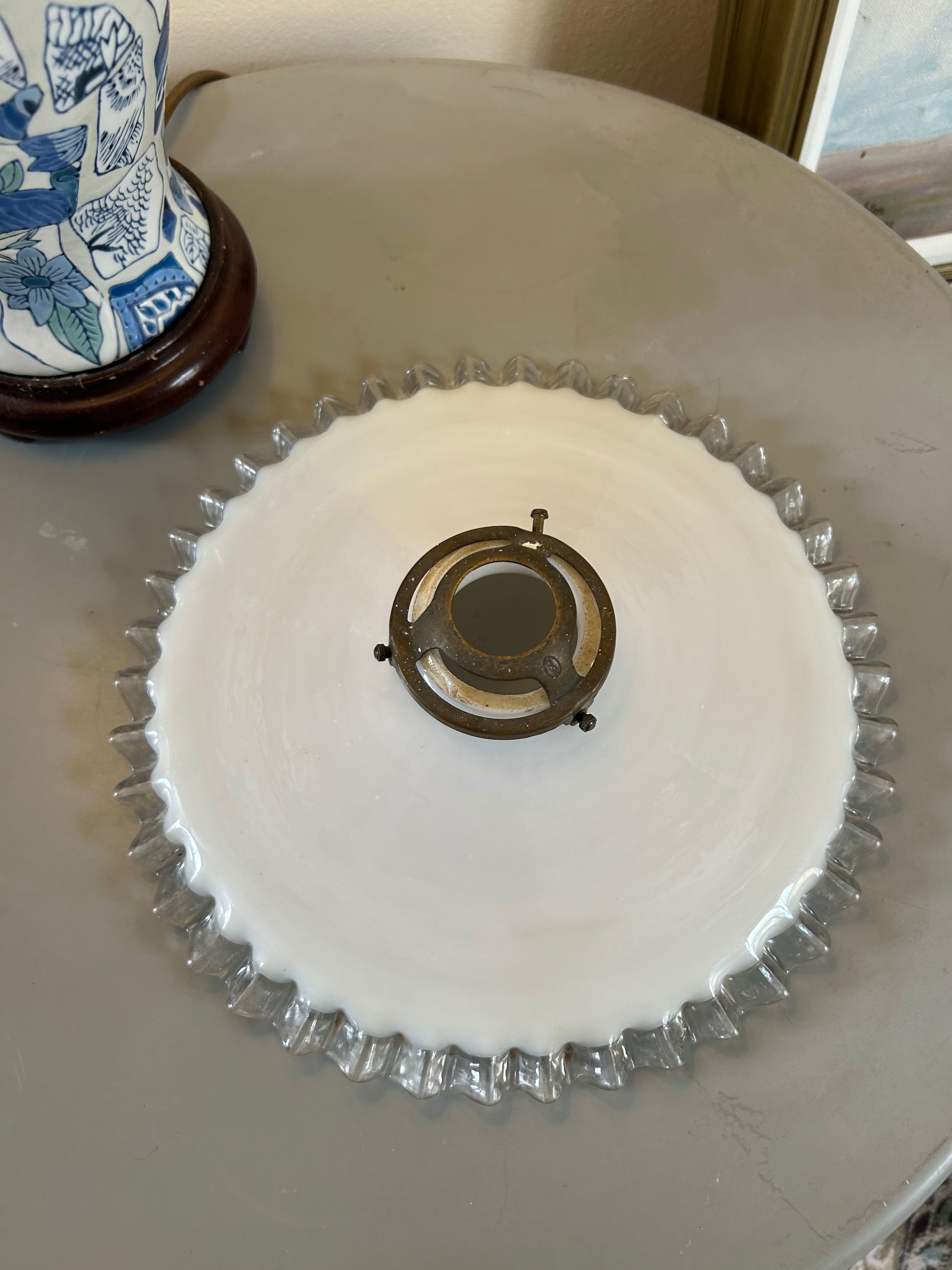 White Opaline and Clear Glass Pendant Lampshade. Hand-crafted, vintage pie crust style pendant lampshade with opaline milk and clear glass edging. Comes with original brass fitment. In perfect condition.